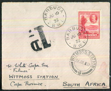 | BARBUDA to CAPE OF GOOD HOPE postal history 1932 underpaid cover to Witmoss Station, Cape Province with Antigua KGV 1d tied BARBUDA JU 10 32 cds, alongside chunky bold \"1d\" Postage Due handstamp and Witmoss Station 27 JUL 32 d/ring, b/stamped St. John\'s JU 15 1932 d/ring. £225 | |