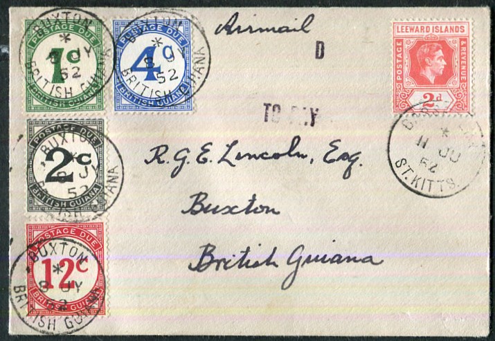 | ST. KITTS to BRITISH GUIANA mixed currencies postal history 1952 underpaid cover to Buxton, British Guiana with Leeward Islands KG6 2d pmk\'d BASSETERRE, St. Kitts */11 JU 52 with sterling \"D TO PAY\" tax handstamp (Proud unrecorded), on arrival 1c, 2c, 4c, 12c Postage Dues pmk\'d Buxton */8 JY 52 cds. A delightful 5-colour combination. £225 | |