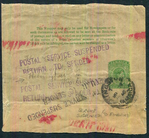 JAMAICA - POSTAL SERVICE TO FINLAND SUSPENDED 1940 KG6 ½d large part newswrapper front to Helsingfors, Finland pmk'd Kingston MR 19 40 with three strikes purplish "POSTAL SERVICE SUSPENED/RETURN TO SENDER" handtamp. £120
