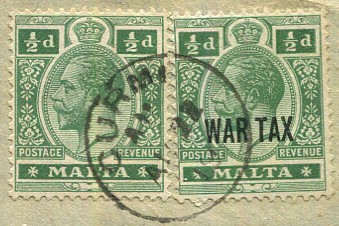CURMI, Malta postmark/cancel AM/AU 22 19 on KGV ½d, KGV ½d WAR TAX (SG.71,92) piece. Ex BIRKETT ALLAN £20