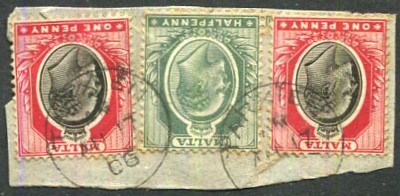 TARXIEN, Malta postmark/cancel AM/AU 17 06 on KE7 ½d, KE7 ½d, 2 x KE7 1d (SG.47,48) piece. Ex BIRKETT ALLAN £16
