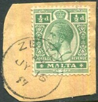 ZEITUN, Malta postmark/cancel AM/MY 13 18 on KGV ½d, KGV ½d WAR TAX (SG.71,92) piece. Ex BIRKETT ALLAN £6