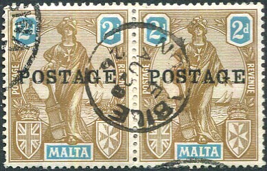 NOTABILE, Malta postmark/cancel E/AU 28 26 on pair KGV 2d ovp'd "POSTAGE" (SG.147). Ex BIRKETT ALLAN £7