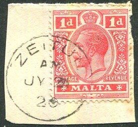 ZEITUN, Malta postmark AM/JY 21 20 on KGV 1d (SG.73a) piece. Ex BIRKETT ALLAN £16