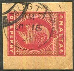 MUSTA, Malta postmark AM/JU 16 04 on KE7 1d carmine Post Card cut-out piece. Ex BIRKETT ALLAN £60