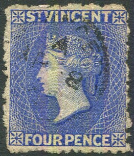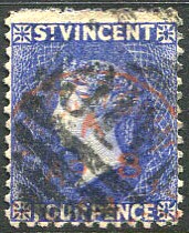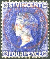 the ST. VINCENT cds in red ink dated A/MY 28 83 overstruck indistinct black "A10" on 1882-82 QV 4d ultramarine P.14. Ex DUGGLEBY