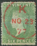 "K" used KINGSTOWN, St. Vincent postmark/cancel a stunning appearance and rare FORGERY in red ink dated NO 23 77 on 1878 QV 6d light yellow-green upright star wmk (SG.26a). Ex MESSENGER £60