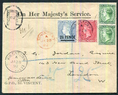 ST. VINCENT - elusive grey-blue on cover 1892 reg. G.P.O. signed O.H.M.S. cover to New Bond Street, London with QV ½d green x 2, QV 1d red, "2½ PENCE" on QV 1d grey-blue (SG.55) pmk'd Kingstown A/JA 28 92 with same date red ST. VINCENT cds alongside, most attractive. £295
