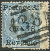 on 1885 5c on QV 36c blue (SG.156), defective corner.