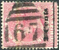 (T.5) SP 13 89 on 1889 ONE PENNY on QV 6d orange (SG.20, Cat.£65). Very rare use at Tarkwa and an early date (Macrae listing ERD being AU 30 89).