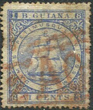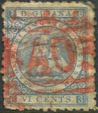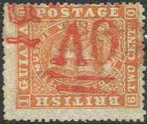 | The "1½ A03" accountancy handstamp, British Guiana postmark/cancel Proud Type A4, low sitting "2") in red ink on 1875 6c (SG.94), some perf. faults. Proud has no recorded dates but covers are recorded for AU 14 1875, and OC 18 1875 £30 | |