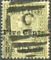 "5" used JAELA, Ceylon numeral cancel on 1890 5c on QV 15c olive-green (SG.233). £40