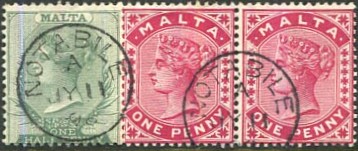 A/JY 11 98 on horiz. pair QV 1d (SG.21) with re-united QV ½d (SG.20) hinged at left. Ex BIRKETT ALLAN