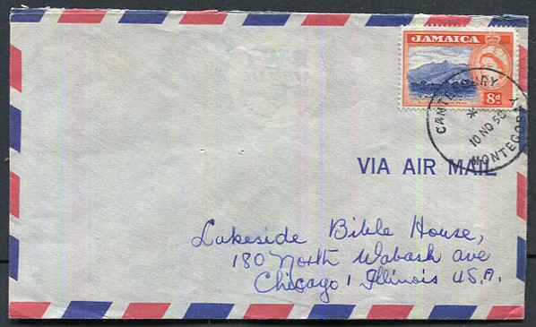 In 1943 a scheme for the recruitment of tradesmen and technicians for the ground staff of the Royal Air Force was started in the West Indies. The scheme was a success and in March 1944 some 2000 West Indians were brought to England for ground staff duties in the RAF. The majority were Jamaicans but recruits from all West Indies colonies including British Guiana and British Honduras were amongst them. A further contingent of 1,935 arrived in the December and some West Indians were accepted for aircrew. The illustrated cover from Mandeville pmk’d SP 15 1945 is addressed to 723156 a/c Gardner O.G., c/o West India Committee, London and forwarded 3 OCT 1945 to 72.MU. R.A.F. CAMP, Roade, Northamptonshire.