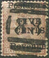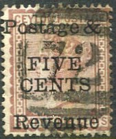 on 1885 5c on 64c red-brown P.14 x 12½ (SG.173, Cat.£55).