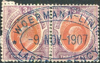 purple dbl-ring oval dated 9 NOV 1907 on re-united pair KE7 (SG.58).