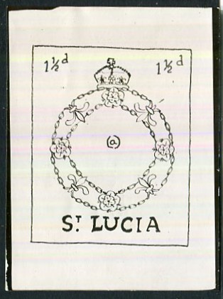 bromide of unfinished artwork showing rosettes and fleur-de-lys surmounted by crown for a KG6 1½d issue.
