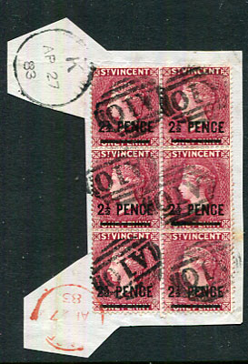 1883 piece with rare block of six 2½ PENCE on QV 1d lake (SG.40) individually cancelled black horiz. A10 with black K AP 27 (83) and red ST. VINCENT A/AP 27 83 alongside, central pair with light vertical crease. Ex George BLAKEY, Stephen SHARP, Vincent DUGGLEBY.