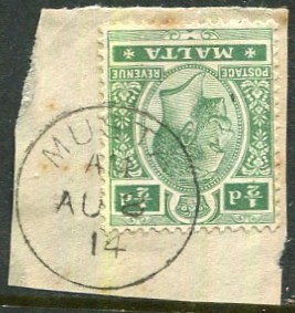 AM/AU 8 14 on KGV ½d (SG.71) piece, some toning. Ex BIRKETT ALLAN