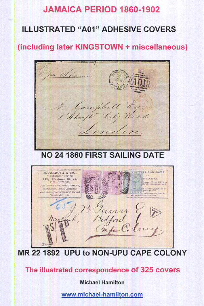 (WIP-140) You can now order and pay for your own DIGITAL copy by pdf (no refunds, but TWO free further updates can be had as and when requested). 184 covers, a study mostly in b/w, which makes its own statement due the lack of excitement attached to the many 6d packet rate covers to the UK. However, if you think this would be low down on your list for a display, the lack of colour is made up by character, and a fine display can embrace the rare twin "A01", the unique 6d with JAMAICA/SHIP LETTER handstamp to Ryde I.O.W., the 1/- green cover, GB added on incoming transit from Santa Marta, Colombia, mail to the Post Towns, and in addition to the very common 6d packet rates of 3d, 4d, 8d, 9d, 1/-, 1/2, 1/4, 1/8, 2/-, 2/8d, 3/-, 9/- will be found. Provenance added when known. Price £60 payable by PayPal or WISE transfer. PDFs incur no dreaded import duty, once ordered can be with you in seconds to any part of the World.