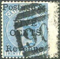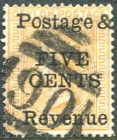 on 1885 5c on 64c red-brown P.14 x 12½ (SG.173, Cat.£55).