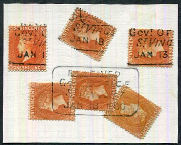 a reconstruction using the QV 1/- orange (SG.58,58a) showing the full framed 4-line "RECEIVED GOVT. OFFICE ST. VINCENT JAN 13 1900" (two dates 13 and 18). Ex DUGGLEBY