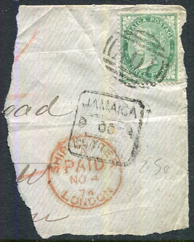 1870 QV 3d green CC wmk (SG.10) on piece pmk'd "A01" with framed "JAMAICA/9 OC 74/SHIP MAIL" showing red SHIP-LETTER/A/PAID/NO 4 74/LONDON, large downward tear sealed by hinges left of adhesive,