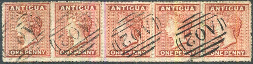 1863-67 QV 1d horizontal strip of five with intermediate shade between dull rose and vermilion, upright small star wmk.